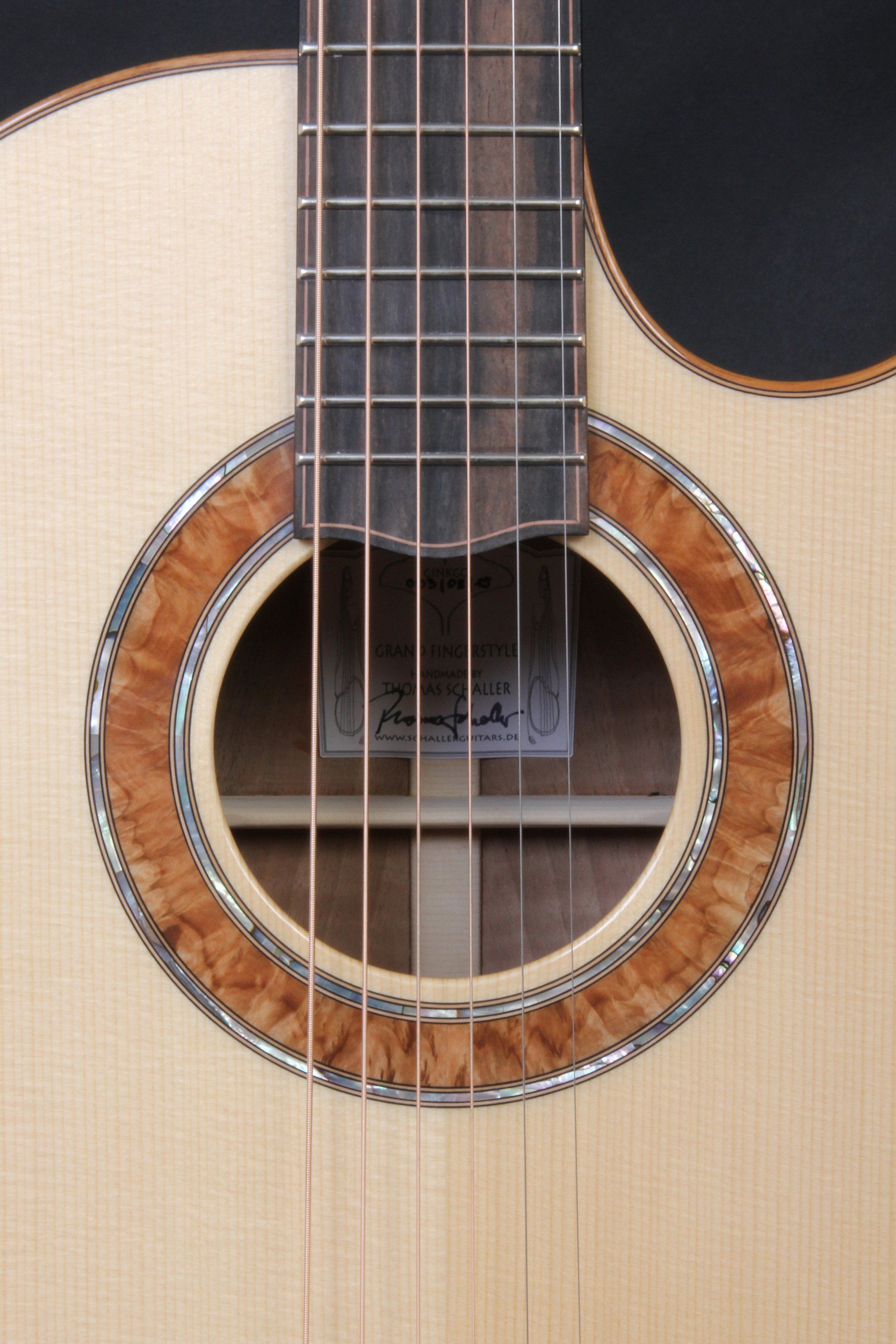 Die Gitarren bekommen eine aufwändige Schallloch-Umrundung und Verzierungen aus edlen Holzspänen und Abalone, gerne personalisiere ich Ihre Wunschgitarre mit einem entsprechenden Inlay im Griffbrett oder auf der Trussrod-Abdeckung. Entsprechend unterschiedlich liegen die Preise meiner handgemachten Gitarren, die Sie auf Nachfrage erhalten.