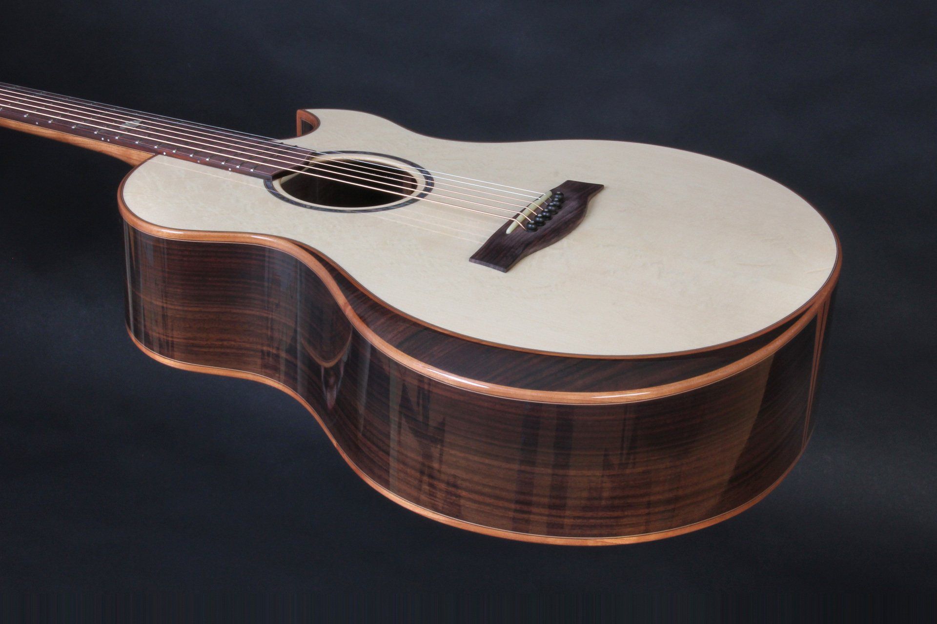 Durch den einmaligen Hals aus Riegelahorn und Verzierungen aus Maserknolle und Abalone eine Augenweide! Optimaler Spielkomfort durch Armrest und Florentine Cutaway. Pänomenales Klangbild!!!
